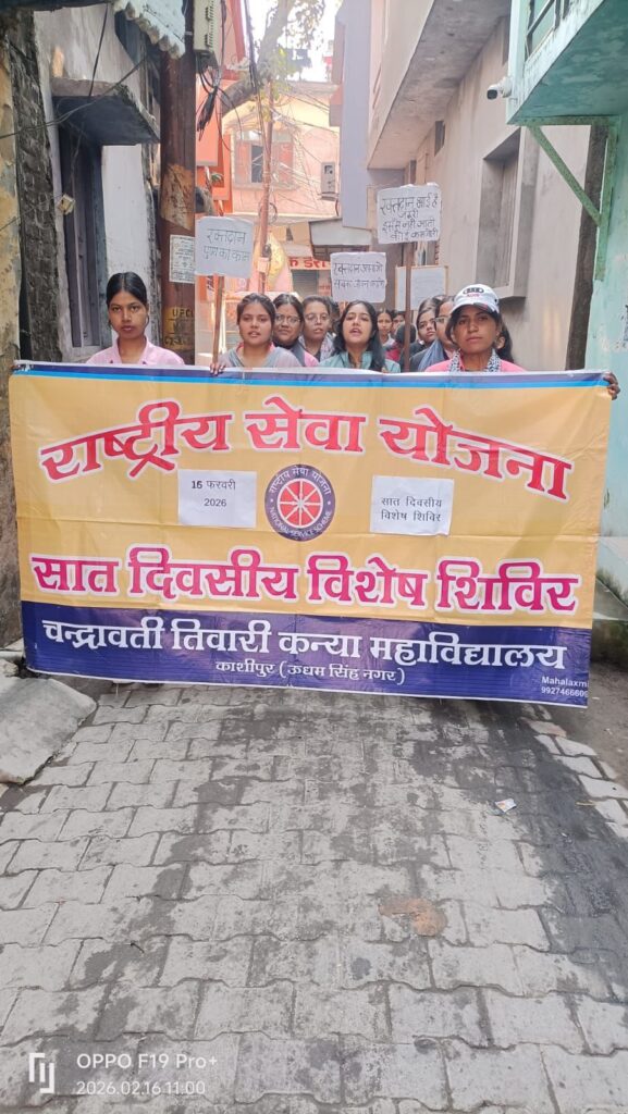 दिनांक 16. 2. 2026 को एन. एस. एस. सात दिवसीय विशेष शिविर के चौथे दिन शिविर स्थल कटरामालियान में स्वयंसेवियों के रक्तदान जागरुकता रैली निकाल कर जनमानस को रक्तदान करने के लिए जागरुक किया । बौद्धिक सत्र में तबाता वर्कआउट क्लब के ट्रैनर हिमांशु सिंह ने फिटनेस, संतुुलित आहार, स्वस्थ खानपान, व्यायाम एवं फिट रहने के तरीकों की विस्तृत जानकारी दी इस अवसर पर महाविधालय की प्राचार्या डाॅ0 कीर्ति पन्त, उपप्राचार्या डाॅ0 दीपिका गुङिया आत्रेय, कार्यक्रम अधिकारी डाॅ0 वन्दना सिहं, डाॅ0 गीता मेहरा, समस्त स्टाॅफ, कु. शिवानी, प्रिंयका, हर्षिता, आदि उपस्थित रहें।