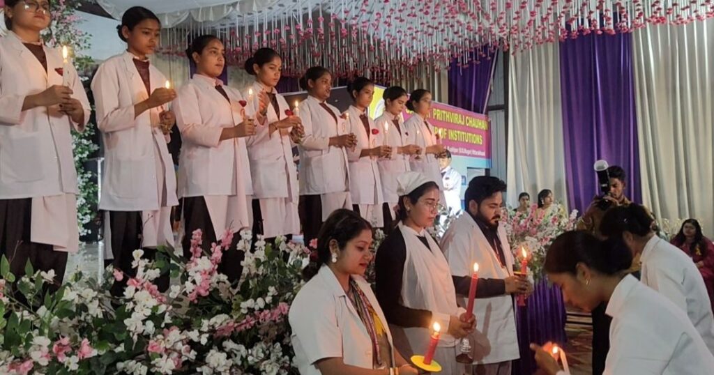 काशीपुर। सम्राट पृथ्वीराज चौहान ग्रुप ऑफ इंस्टीट्यूशंस के कॉलेज ऑफ नर्सिंग में प्रथम वर्ष के विद्यार्थियों के लिए लैंप लाइटिंग एवं ओथ टेकिंग सेरेमनी का भव्य आयोजन किया गया। कार्यक्रम का उद्देश्य नर्सिंग विद्यार्थियों को सेवा, समर्पण और मानवता के पवित्र व्यवसाय के प्रति प्रेरित करना रहा।